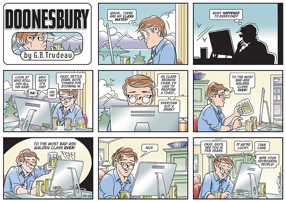 We met online for luncheons, webinars, yoga, cocktails, music, res-college get-togethers, panel discussions and a memorial service. We shipped two books to classmates.